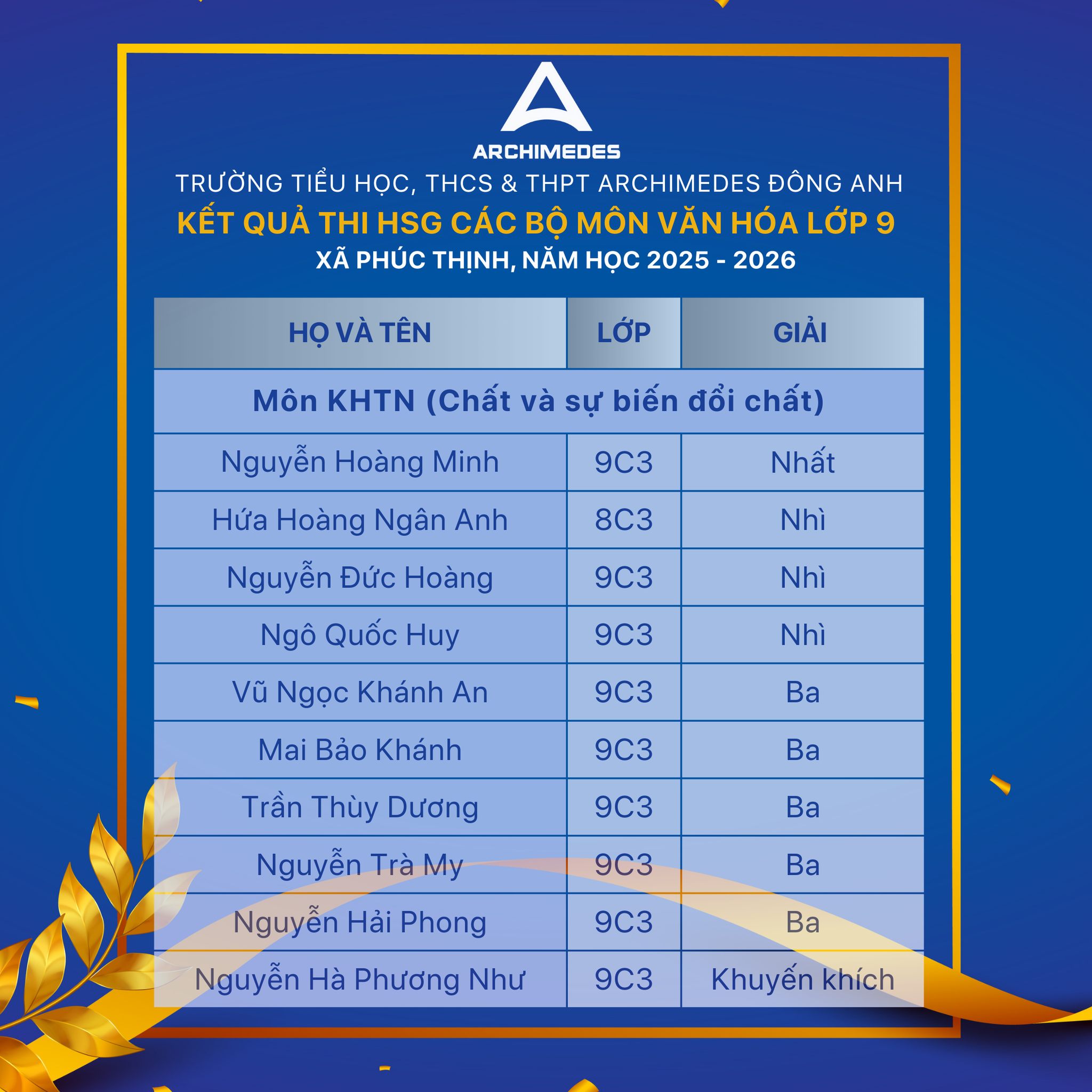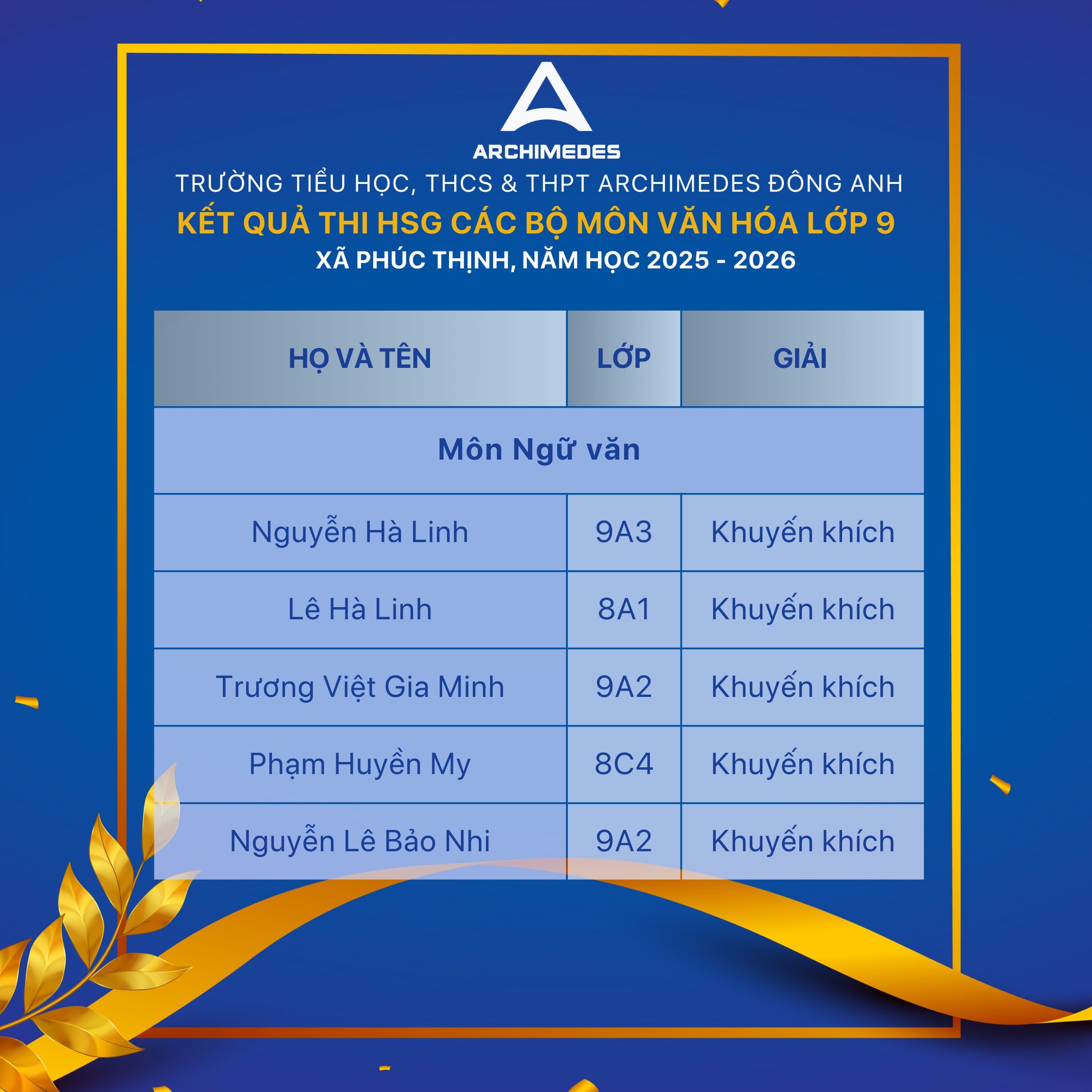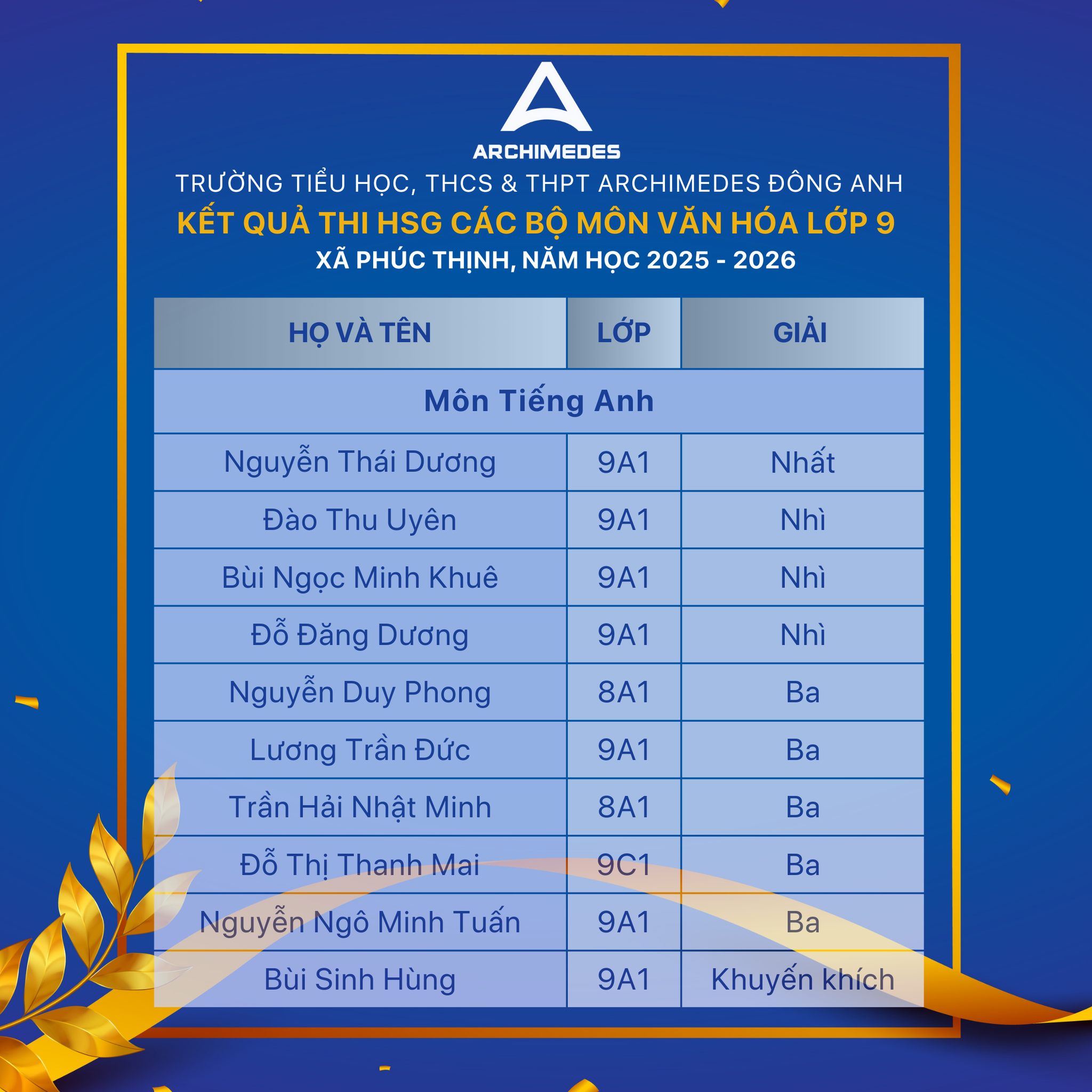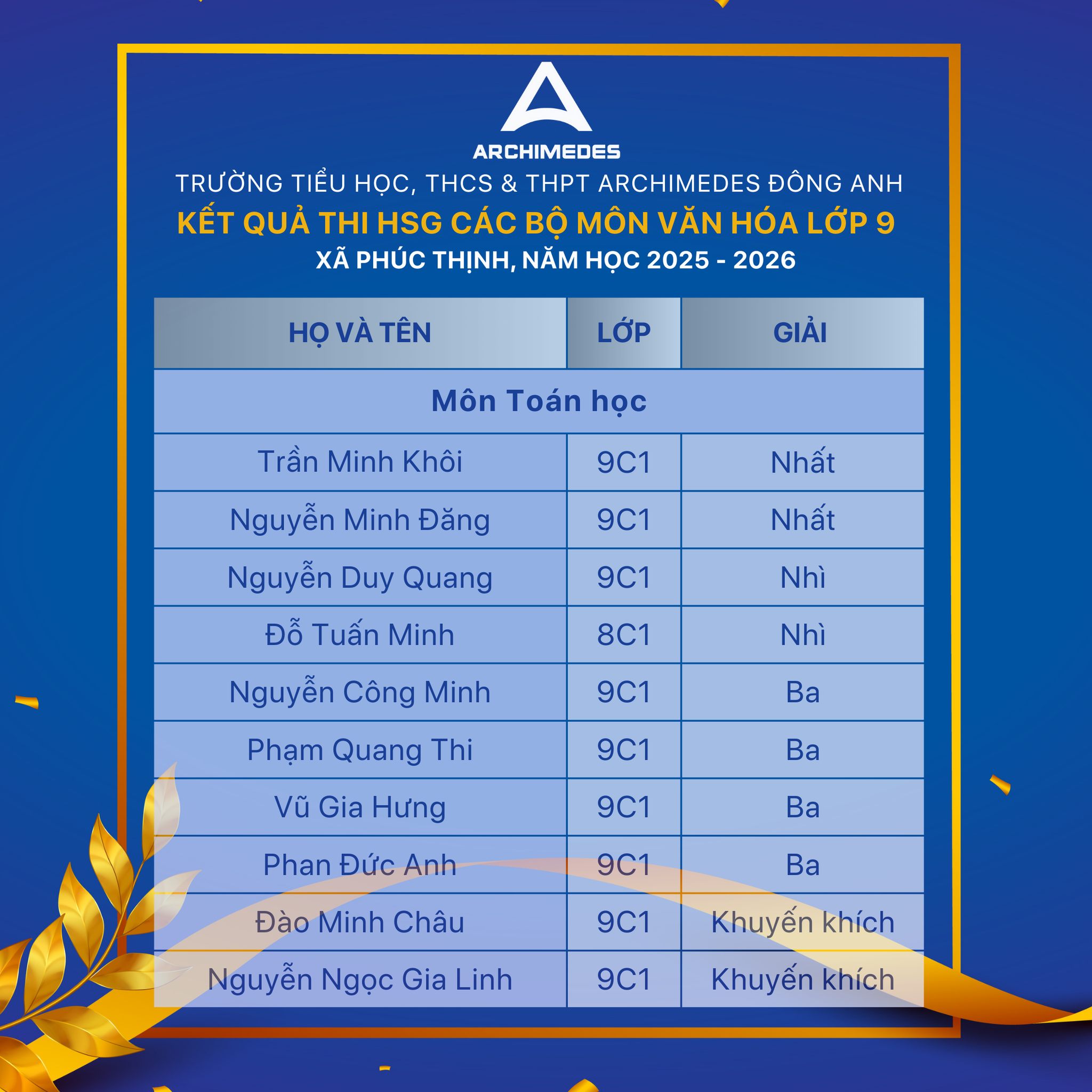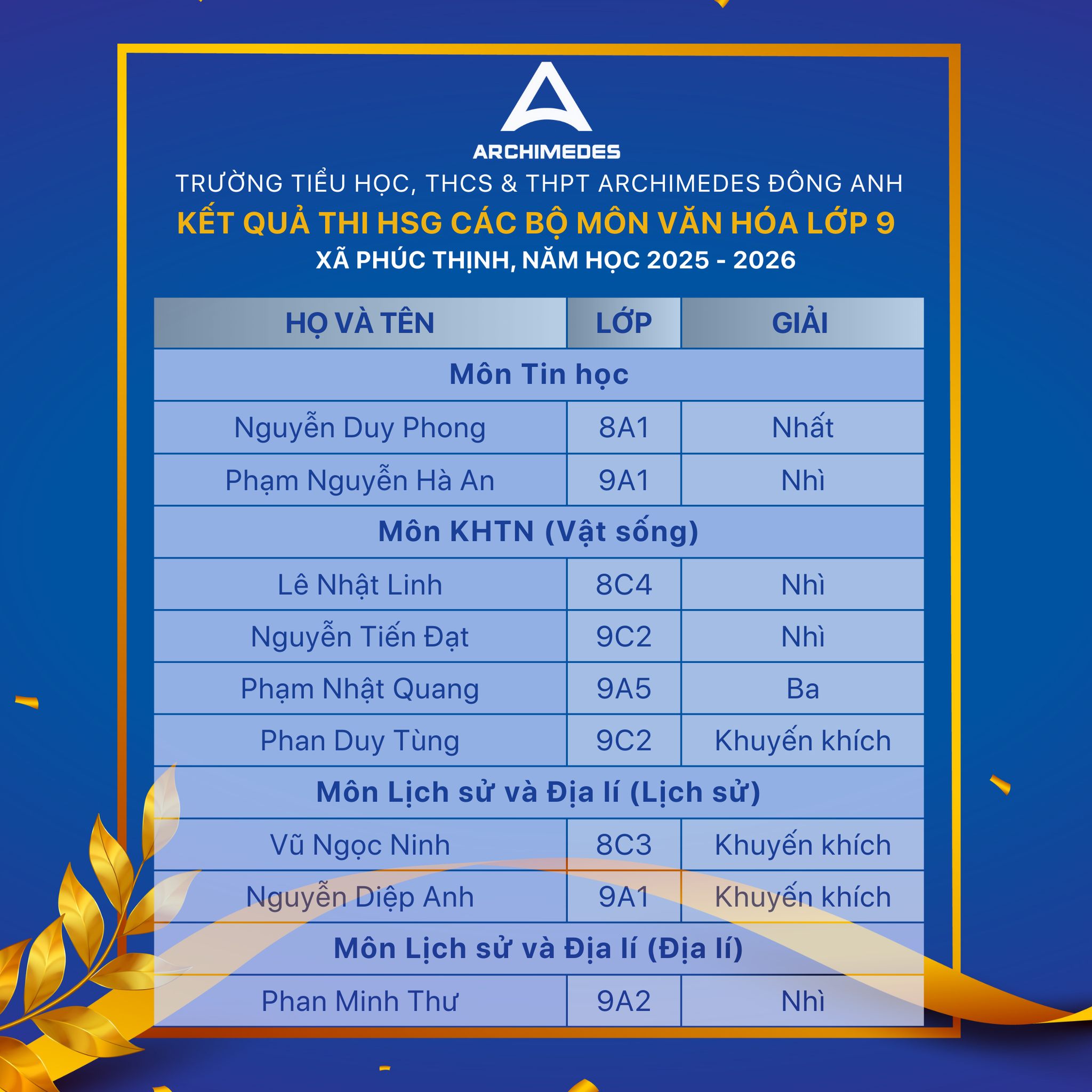 Arcers cấp Trung học, Trường Tiểu học, THCS & THPT Archimedes Đông Anh, vừa mang về tin vui rực rỡ từ Kỳ thi Học sinh giỏi các bộ môn Văn hóa lớp 9, xã Phúc Thịnh, năm học 2025 - 2026: 54 giải thưởng với 06 giải Nhất, 14 giải Nhì, 20 giải Ba và 14 giải Khuyến khích. Đặc biệt, Nhà trường chúc mừng 26 Arcers chính thức và 05 Arcers dự bị vào Đội tuyển, tiếp tục hành trình chinh phục Kỳ thi Học sinh giỏi cấp Thành phố Hà Nội sắp tới.