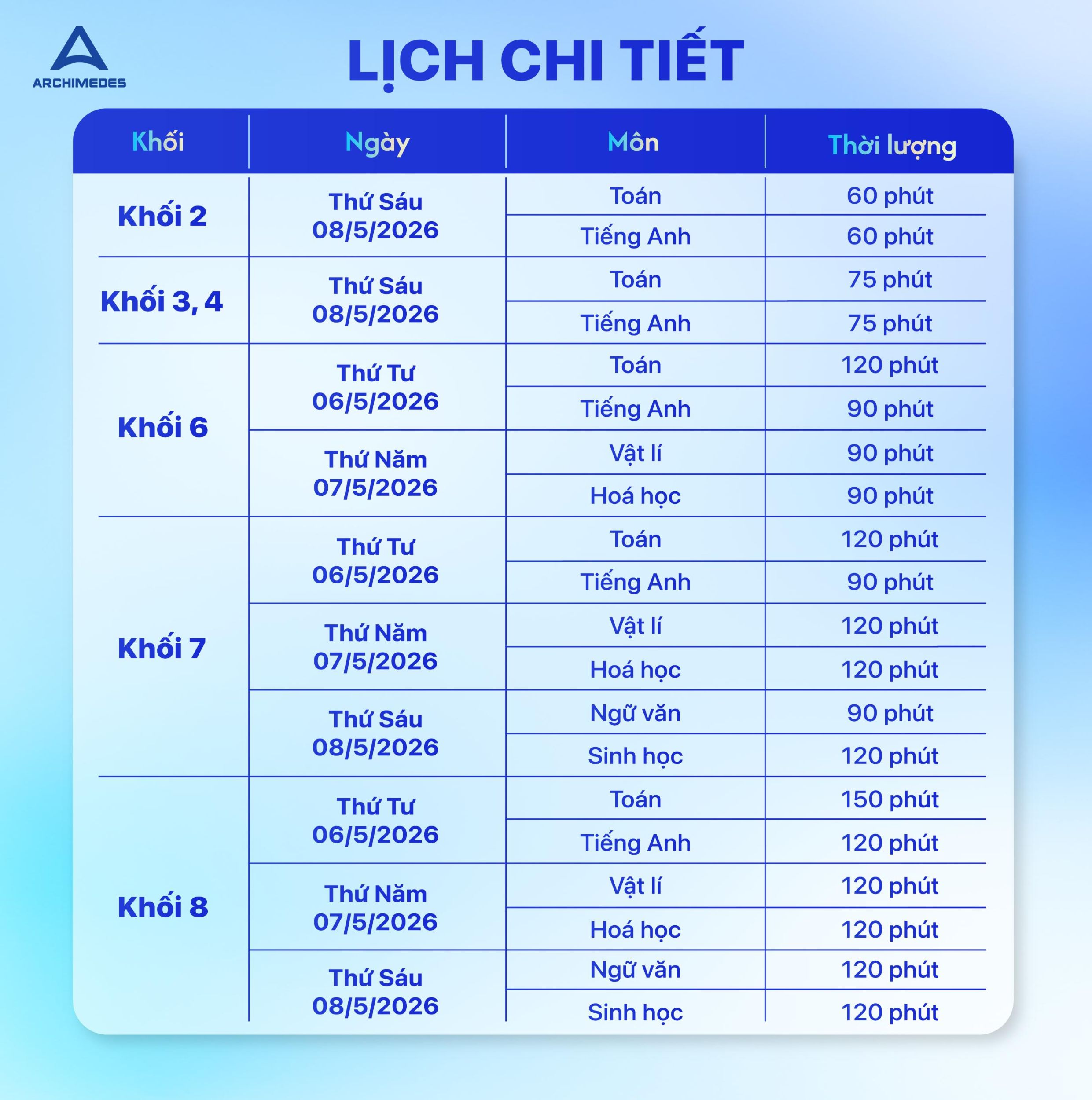 Lệ phí: Archimedes School tài trợ 100% lệ phí năm 2026 (trị giá 1.000.000 VNĐ/môn)