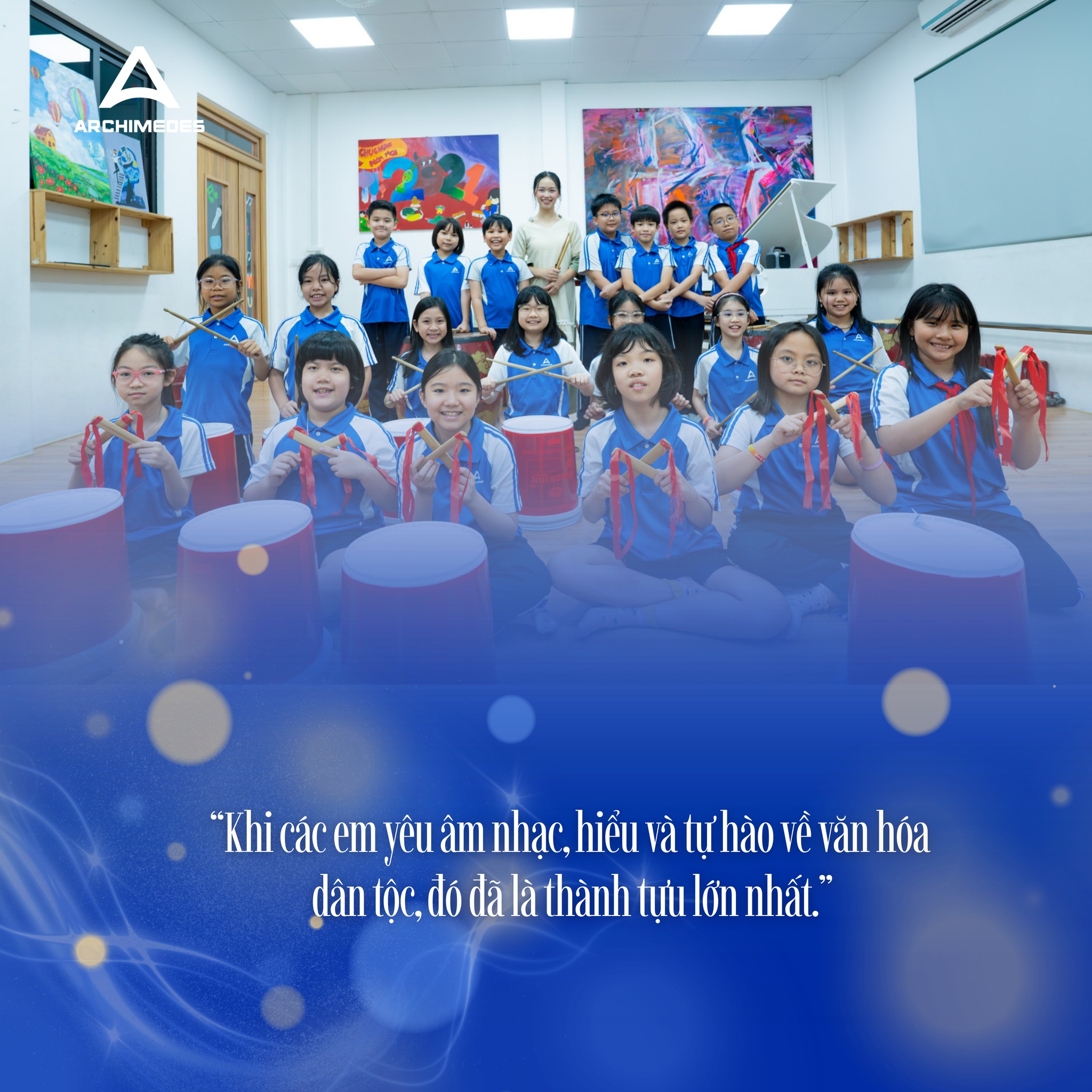 Một trong những điểm nhấn nổi bật tại Trường Tiểu học, THCS & THPT Archimedes Đông Anh là phòng nhạc cụ truyền thống – không gian nơi học sinh được trực tiếp trải nghiệm và thực hành với các loại hình nghệ thuật dân tộc như đàn bầu, đàn T’rưng, trống và bộ gõ dân tộc.