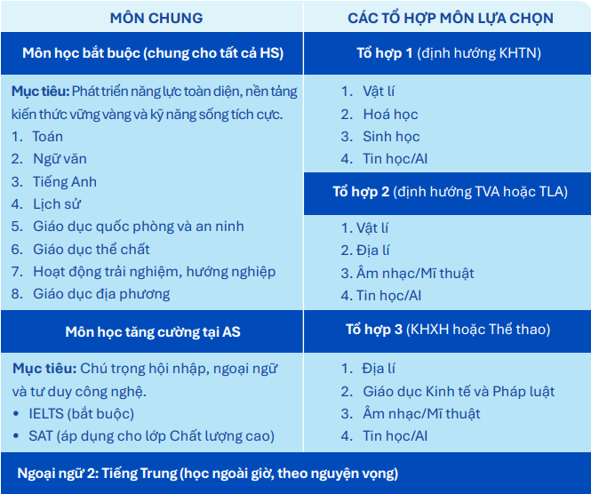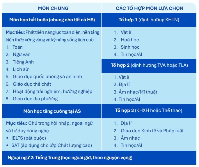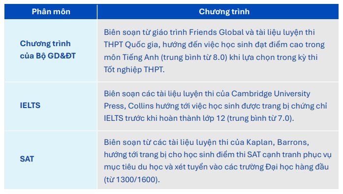 Đặc biệt, chương trình học của cấp THPT được xây dựng một cách tập trung, có trọng điểm: Thực hiện theo chương trình giáo dục phổ thông 2018 của Bộ Giáo dục và Đào tạo; Tích hợp những cải tiến hiện đại theo xu hướng quốc tế, đảm bảo giúp học sinh không chỉ hoàn thành xuất sắc chương trình quốc gia mà còn đáp ứng yêu cầu tuyển sinh mới từ các trường đại học hàng đầu.