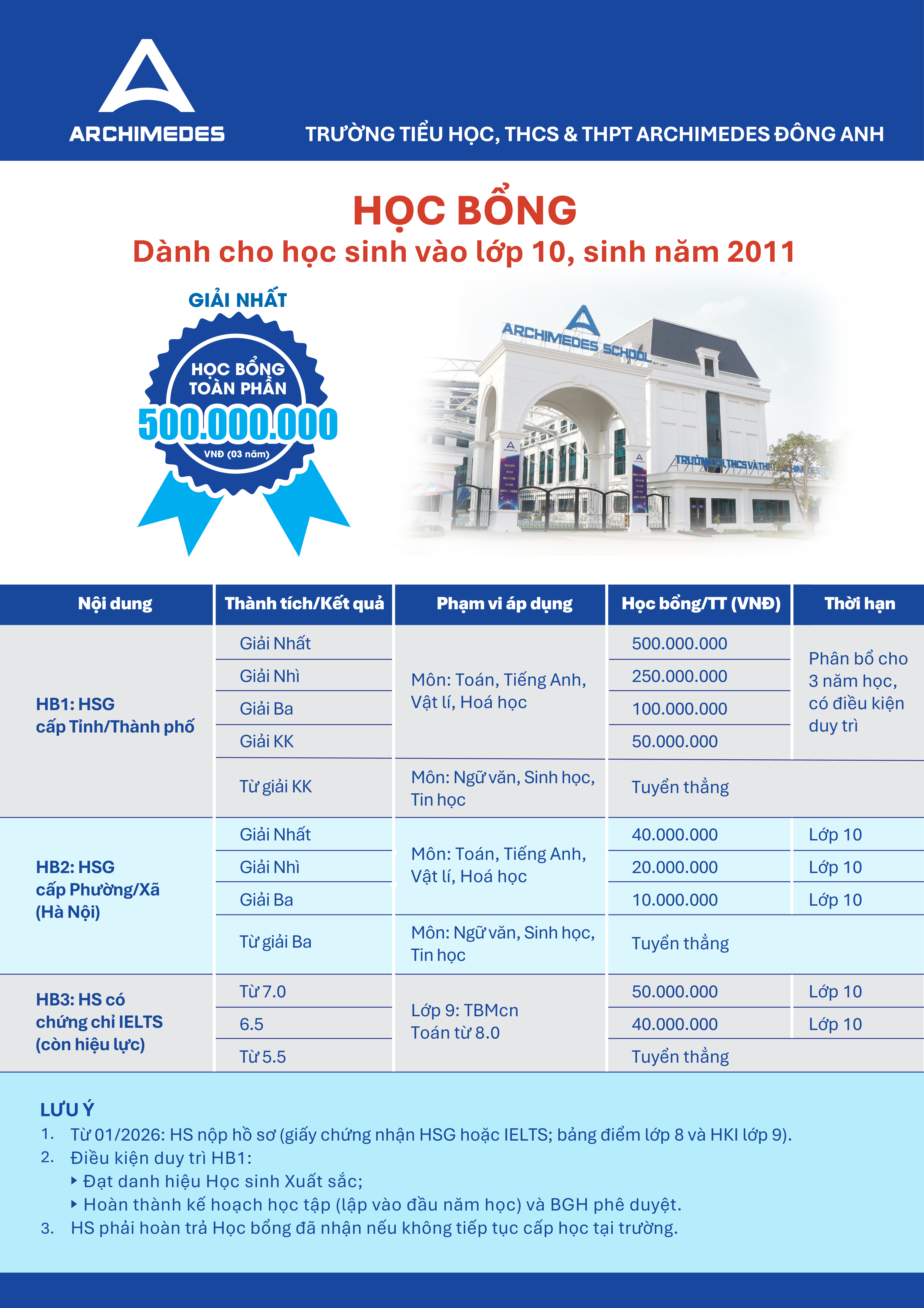 Hành trình THPT luôn là cột mốc quan trọng trong quãng đời học sinh. Đây là giai đoạn mỗi bạn trẻ tìm thấy năng lực của mình, rèn luyện bản lĩnh và chuẩn bị hành trang bước vào những giấc mơ rộng mở hơn. Với tinh thần ấy, Hệ thống Giáo dục Archimedes School (AS) trân trọng gửi tới Quý CMHS và các con học sinh Thông tin Tuyển sinh vào lớp 10, năm học 2026 – 2027.